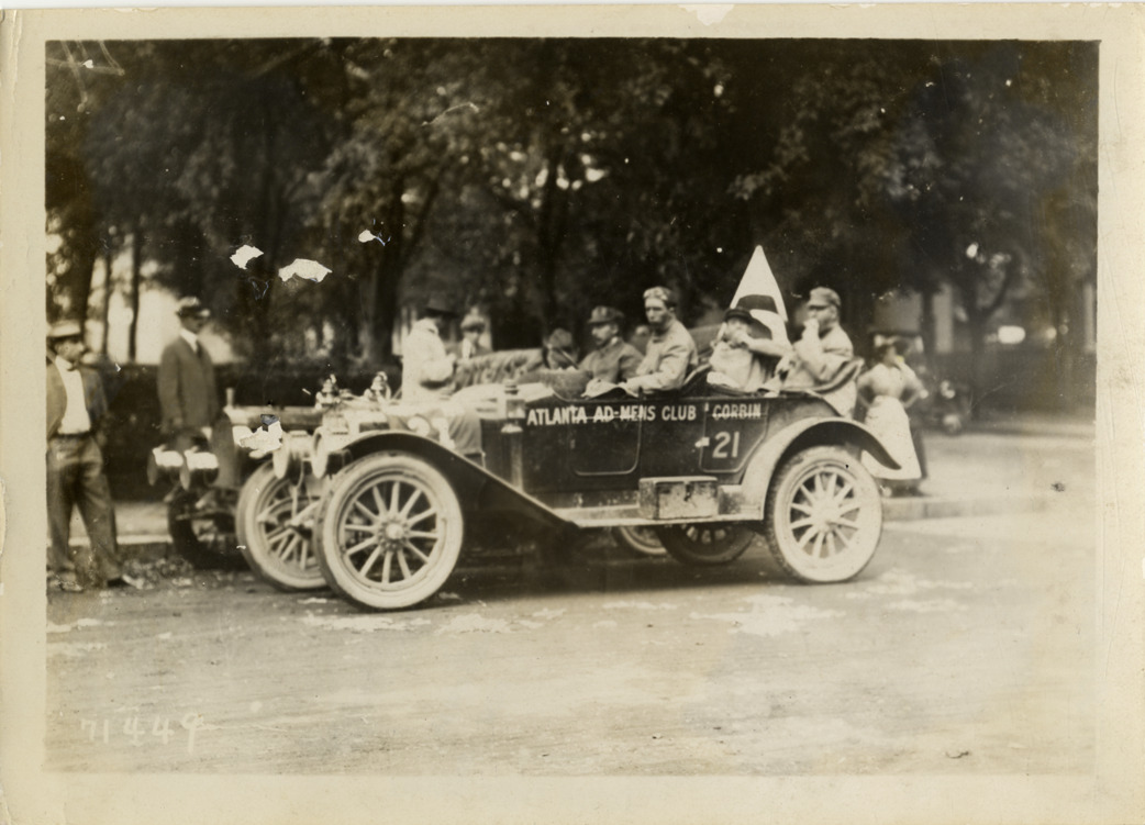 View of motorists posing in Corbin car no. 21 during the 1911 Glidden Tour. Car was entered by the Atlanta Ad Men's Club. Stamped on back: "Spooner & Wells, Inc., photographers, telephones 3472-3473 Columbus, 1931 Broadway, New York." Handwritten on back: "Tours--Glidden Tour, 1911."