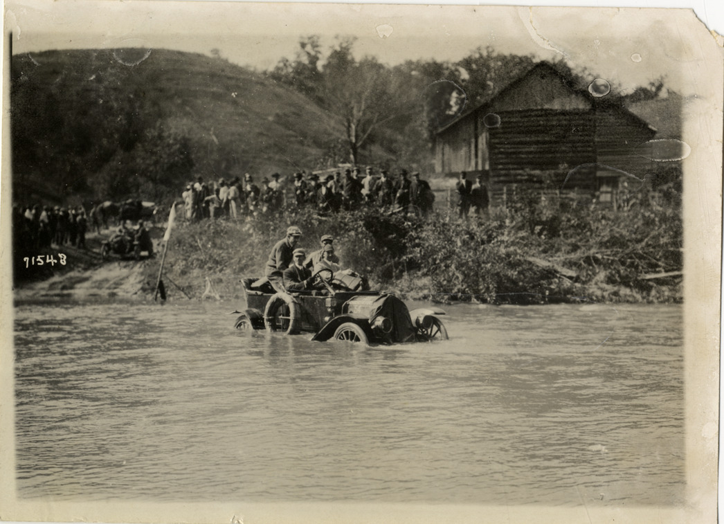 Motorists in automobile crossing Back Creek near Roanoke, Virginia, 1911 Glidden Tour