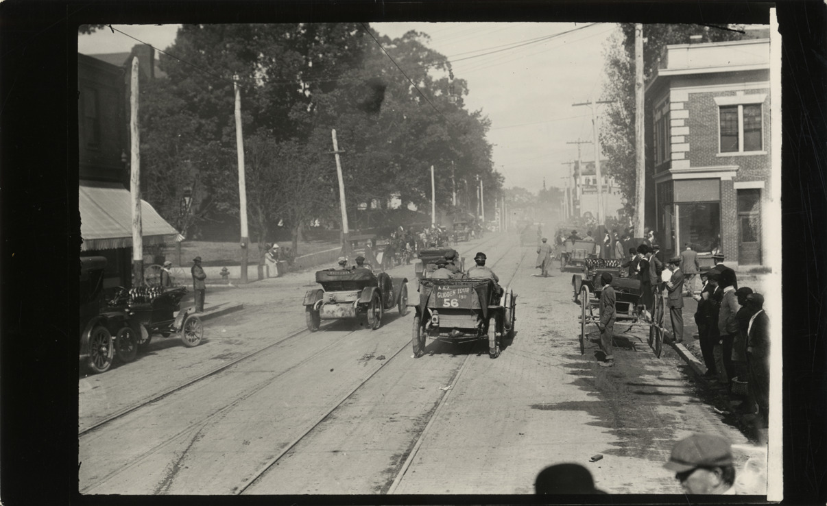 Rear view of motorists in Halladay and Marathon cars traveling on street during the 1911 Glidden Tour. Horse-drawn carriage on right; spectators stand on sidewalks. Handwritten on back: "Tours--Glidden Tour, 1911."