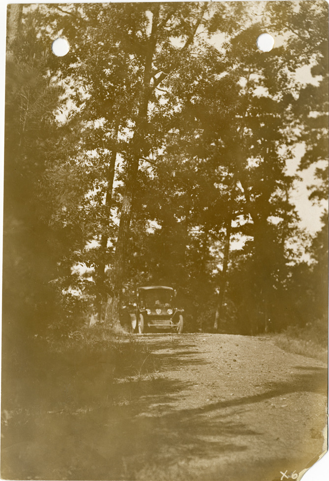 View of Flanders electric car traveling on rural dirt road near Wesson, Mississippi during the pathfinding expedition for the 1912 Glidden Tour. The pathfinding tour covered a route from Detroit, Michigan to New Orleans, Louisiana, but the 1912 Glidden Tour was canceled. Stamped on back: "Spooner & Wells, Inc., photographers, 1231 Woodward Ave., Detroit, Mich., telephone North 1745." Handwritten on back: "Pathfinder over a hill near Wesson, 1912. Tours--Glidden Tour, 1912."