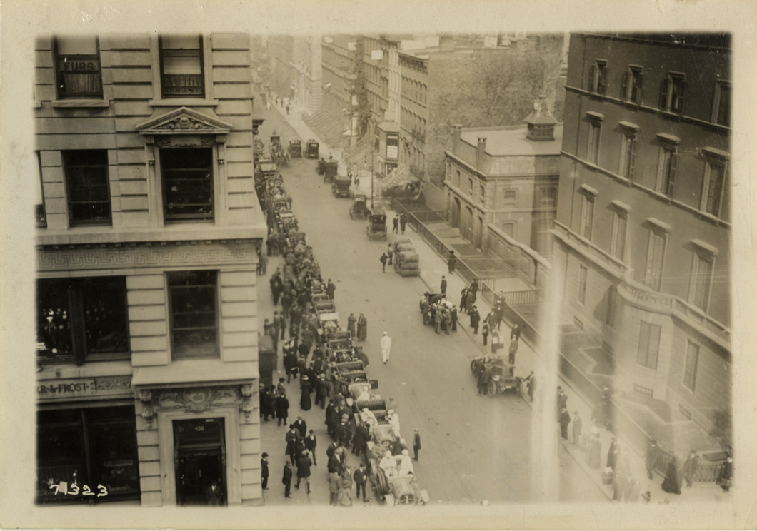 Bird's-eye view of motorists and spectators with cars lined up in street during the 1911 Glidden Tour. Stamped on back: "Spooner & Wells, Inc., photographers, telephones 3472-3473 Columbus, 1931 Broadway, New York." Handwritten on back: "Tours--Glidden Tour, 1911."