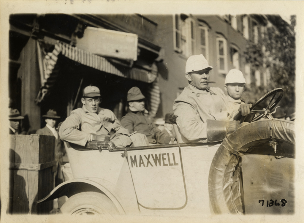 Close-up view of driver and passengers in Maxwell car during the 1911 Glidden Tour. Stamped on back: "Spooner & Wells, Inc., photographers, telephones 3472-3473 Columbus, 1931 Broadway, New York." Handwritten on back: "Tours--Glidden Tour, 1911."