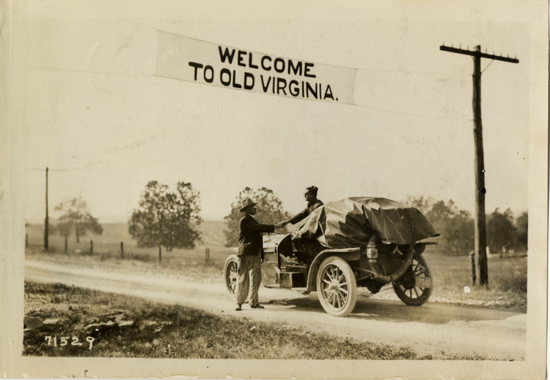 View of motorist in car shaking hands with a man standing under banner during the 1911 Glidden Tour. "Welcome to old Virginia" banner is suspended over rural dirt road. Handwritten on back: "Tours--Glidden Tour, 1911."
