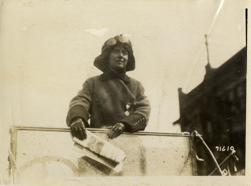 Close-up view of woman posing in car and holding a newspaper during the 1911 Glidden Tour. Stamped on back: "Spooner & Wells, Inc., photographers, telephones 3472-3473 Columbus, 1931 Broadway, New York." Handwritten on back: "Tours--Glidden Tour, 1911."