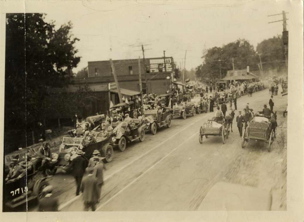 Motorists in automobiles lined up in street, 1911 Glidden Tour