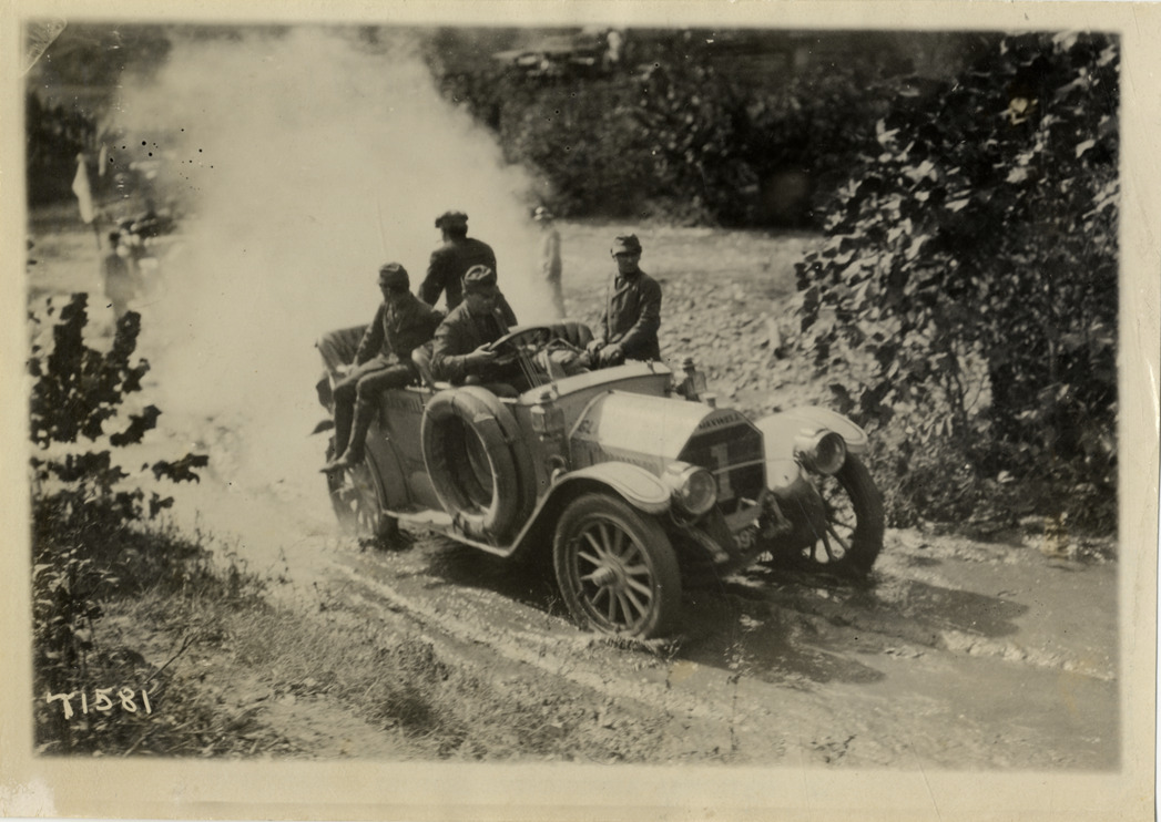 View of motorists in Maxwell car no. 1 crossing Back Creek near Roanoke, Virginia during the 1911 Glidden Tour. Stamped on back: "Spooner & Wells, Inc., photographers, telephones 3472-3473 Columbus, 1931 Broadway, New York." Handwritten on back: "Tours--Glidden Tour, 1911."