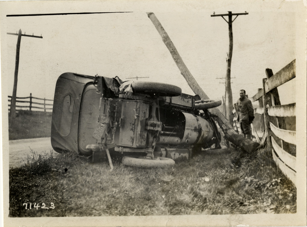 Close-up view of motorist standing next to overturned Pierce-Arrow press car during the 1911 Glidden Tour. Car had collided with telegraph pole on roadside. Handwritten on back: "Tours--Glidden Tour, 1911."