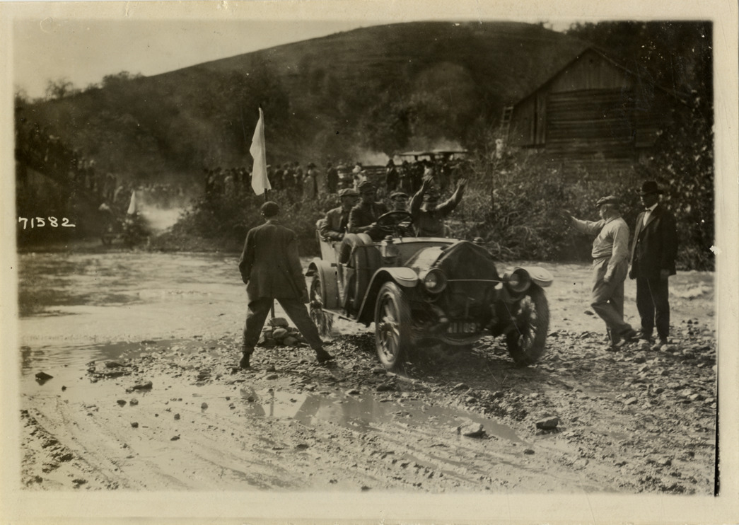 View of motorists in car crossing Back Creek near Roanoke, Virginia during the 1911 Glidden Tour. Men with flag in foreground; spectators on riverbank in background. Automobile passenger raises his arms. Stamped on back: "Spooner & Wells, Inc., photographers, telephones 3472-3473 Columbus, 1931 Broadway, New York." Handwritten on back: "Tours--Glidden Tour, 1911."