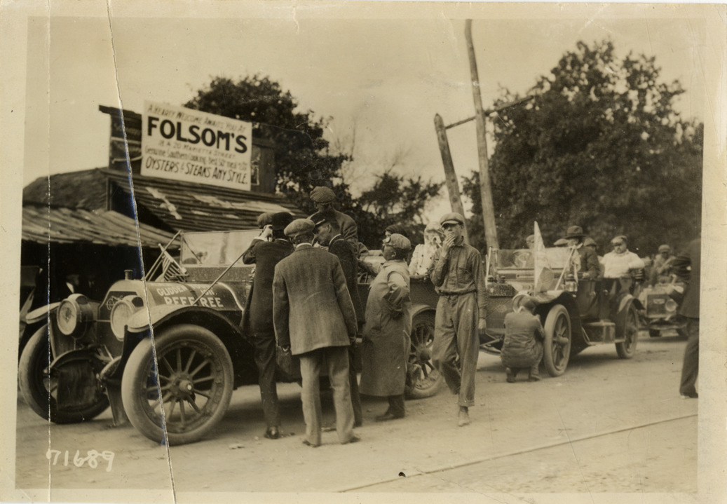 View of men surrounding Cunningham referee car in front of Folsom's restaurant during the 1911 Glidden Tour. Stamped on back: "Spooner & Wells, Inc., photographers, telephones 3472-3473 Columbus, 1931 Broadway, New York." Handwritten on back: "Tours--Glidden Tour, 1911."