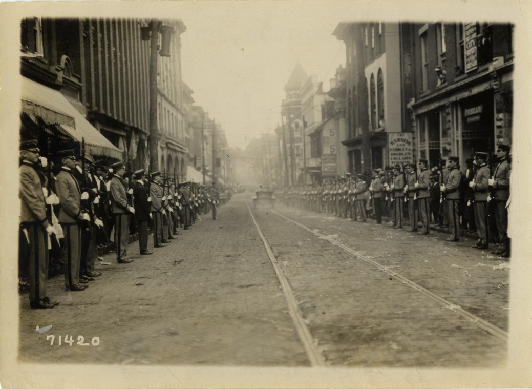 Rear view of car passing soldiers lined up in street during the 1911 Glidden Tour. Uniformed soldiers carry rifles; street is lined with commercial buildings. Stamped on back: "Spooner & Wells, Inc., photographers, telephones 3472-3473 Columbus, 1931 Broadway, New York." Handwritten on back: "Tours--Glidden Tour, 1911."