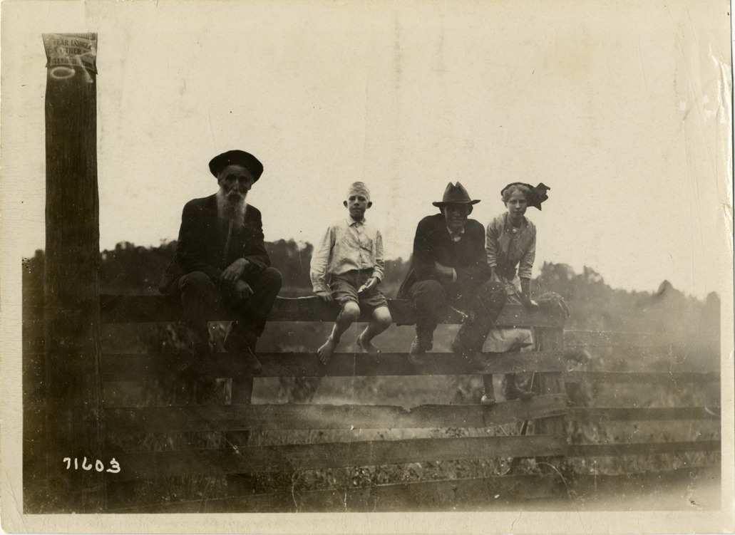View of two men, a young woman and a boy sitting on wooden fence during the 1911 Glidden Tour. Stamped on back: "Spooner & Wells, Inc., photographers, telephones 3472-3473 Columbus, 1931 Broadway, New York." Handwritten on back: "Tours--Glidden Tour, 1911."