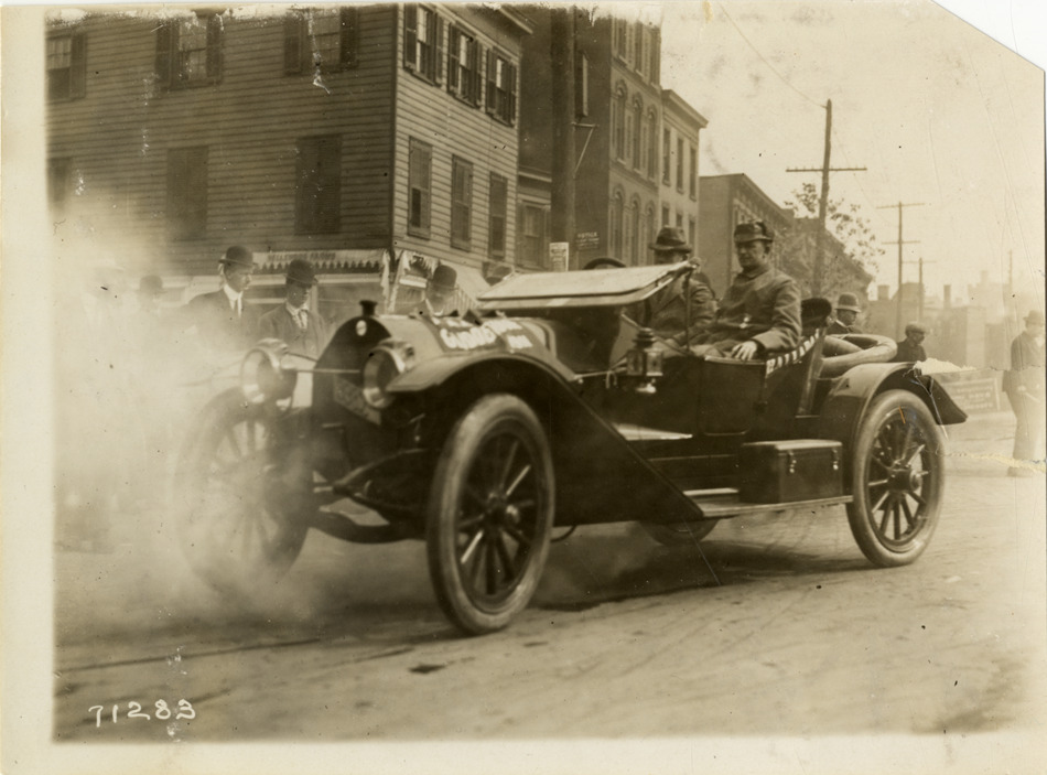 View of motorists in Halladay car during the 1911 Glidden Tour. Buildings in background. Stamped on back: "Spooner & Wells, Inc., photographers, telephones 3472-3473 Columbus, 1931 Broadway, New York." Handwritten on back: "Tours--Glidden Tour, 1911."