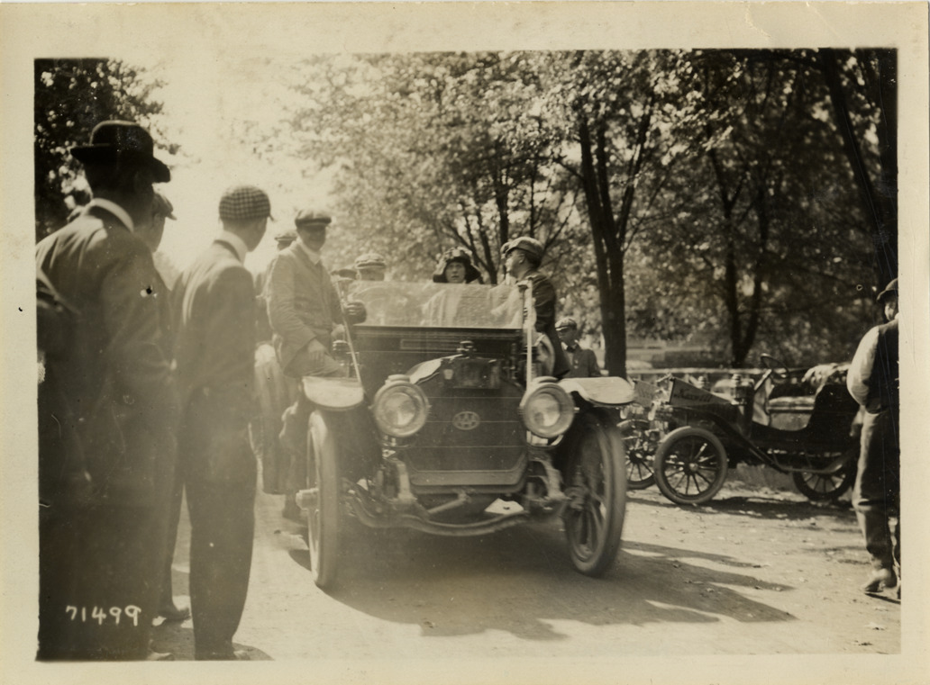 View of motorists in car during the 1911 Glidden Tour. Spectators stand in foreground. Maxwell car is visible in background. Stamped on back: "Spooner & Wells, Inc., photographers, telephones 3472-3473 Columbus, 1931 Broadway, New York." Handwritten on back: "Tours--Glidden Tour, 1911."