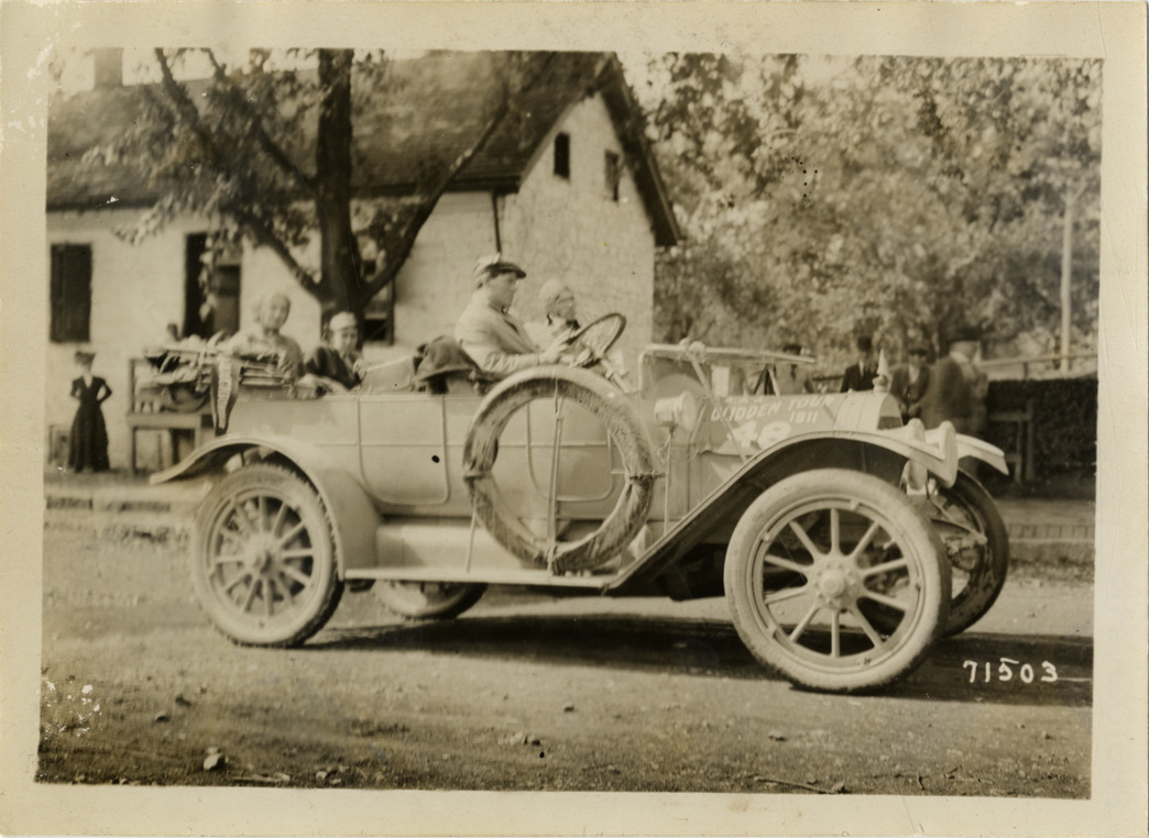View of motorists in Cadillac car no. 48 during the 1911 Glidden Tour. Stone house in background. Stamped on back: "Spooner & Wells, Inc., photographers, telephones 3472-3473 Columbus, 1931 Broadway, New York." Handwritten on back: "Tours--Glidden Tour, 1911."