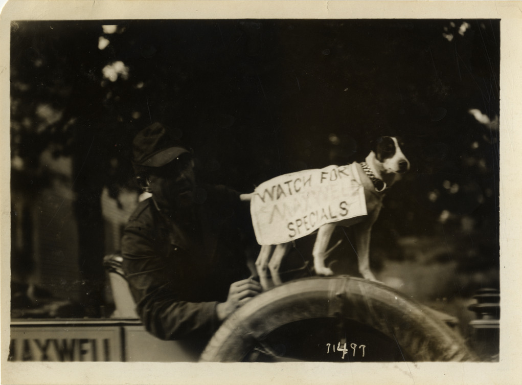 View of dog wearing a "Watch for Maxwell specials" sign during the 1911 Glidden Tour. Dog stands on spare tire of automobile; man in background. Stamped on back: "Spooner & Wells, Inc., photographers, telephones 3472-3473 Columbus, 1931 Broadway, New York." Handwritten on back: "Tours--Glidden Tour, 1911."
