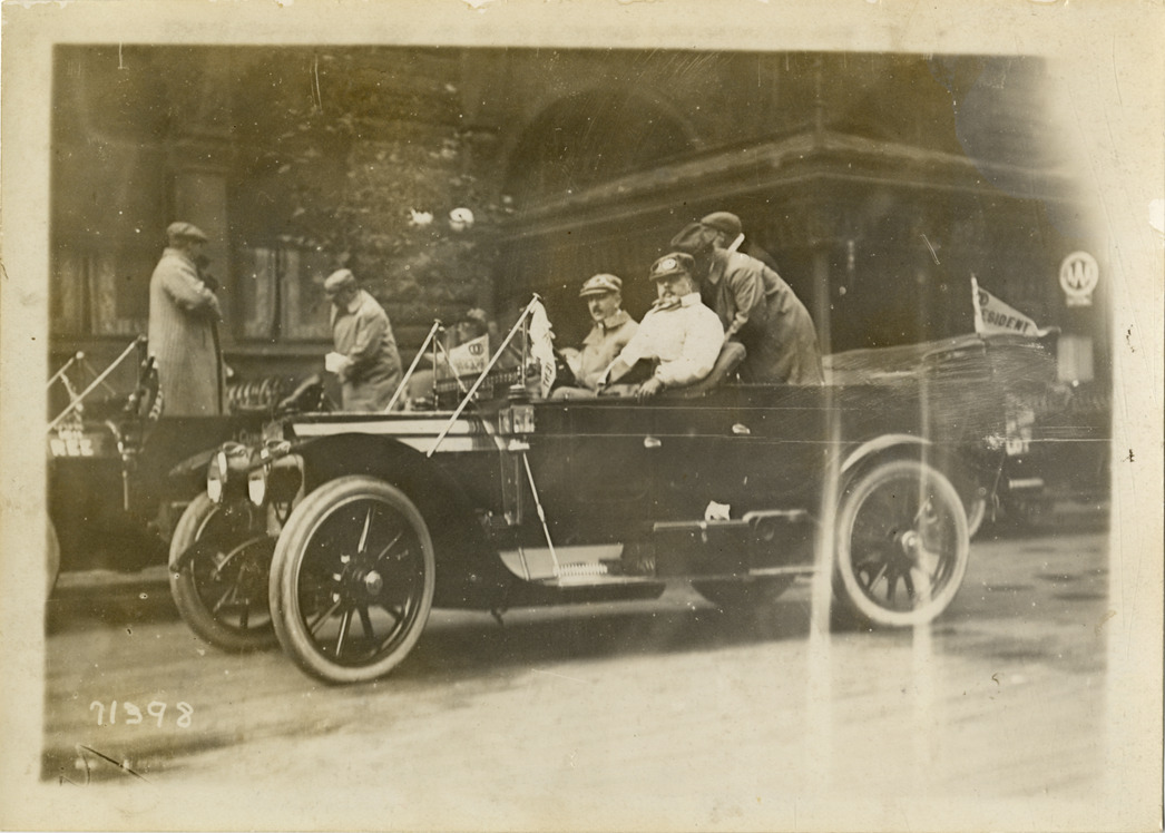 View of Charles J. Glidden and motorists in Garford car during the 1911 Glidden Tour. "President" pennant is displayed on car. Stamped on back: "Spooner & Wells, Inc., photographers, telephones 3472-3473 Columbus, 1931 Broadway, New York." Handwritten on back: "Tours--Glidden Tour, 1911."