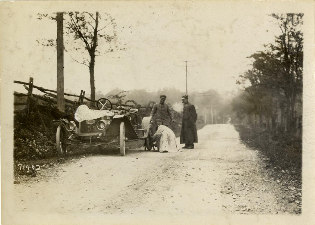 Motorists changing tire on Flanders automobile, 1911 Glidden Tour