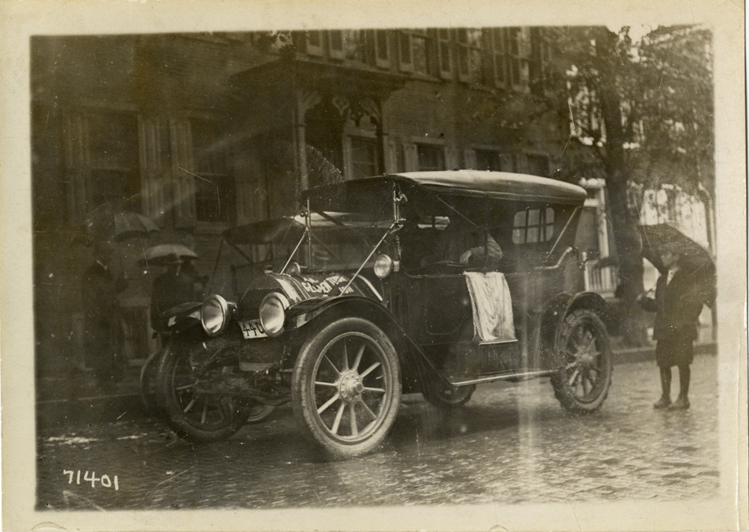 View of spectators, holding umbrellas, standing near car on rainy day during the 1911 Glidden Tour. Stamped on back: "Spooner & Wells, Inc., photographers, telephones 3472-3473 Columbus, 1931 Broadway, New York." Handwritten on back: "Tours--Glidden Tour, 1911."