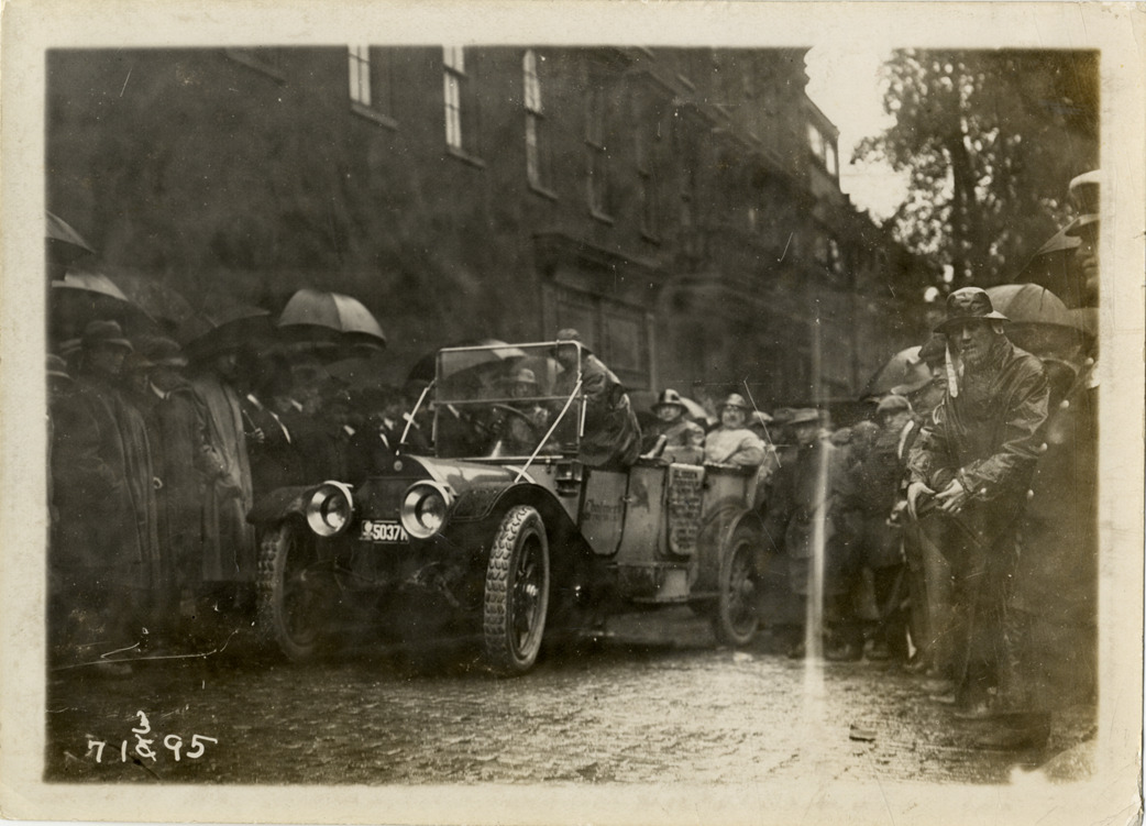 Spectators surrounding Chalmers automobile on rainy day, 1911 Glidden Tour