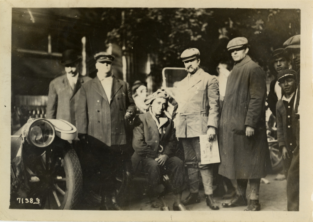 View of group of motorists posing in front of car during the 1911 Glidden Tour. One man holds a newspaper. Stamped on back: "Spooner & Wells, Inc., photographers, telephones 3472-3473 Columbus, 1931 Broadway, New York." Handwritten on back: "Tours--Glidden Tour, 1911."