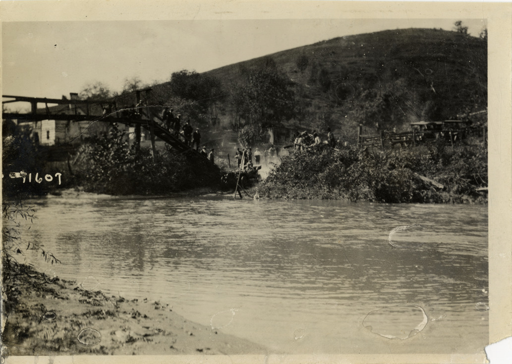 Distant view of motorists in car preparing to cross Back Creek near Roanoke, Virginia during the 1911 Glidden Tour. Spectators on pedestrian bridge in background. Stamped on back: "Spooner & Wells, Inc., photographers, telephones 3472-3473 Columbus, 1931 Broadway, New York." Handwritten on back: "Tours--Glidden Tour, 1911."