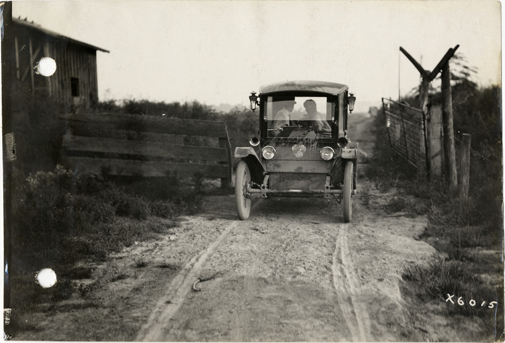 View of Flanders electric car passing through gate at Honey Island, Louisiana during the pathfinding expedition for the 1912 Glidden Tour. The pathfinding tour covered a route from Detroit, Michigan to New Orleans, Louisiana, but the 1912 Glidden Tour was canceled. Handwritten on back: "A gate near head of Honey Island, pathfinding trip, 1912. Tours--Glidden Tour, 1912."