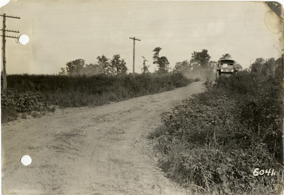View of Flanders electric car traveling on rural dirt road near Greenwood, Mississippi during the pathfinding expedition for the 1912 Glidden Tour. The pathfinding tour covered a route from Detroit, Michigan to New Orleans, Louisiana, but the 1912 Glidden Tour was canceled. Stamped on back: "Spooner & Wells, Inc., photographers, 1231 Woodward Ave., Detroit, Mich., telephone North 1745." Handwritten on back: "Pathfinder three miles south of Greenwood, Miss., 1912. Tours--Glidden Tour, 1912."