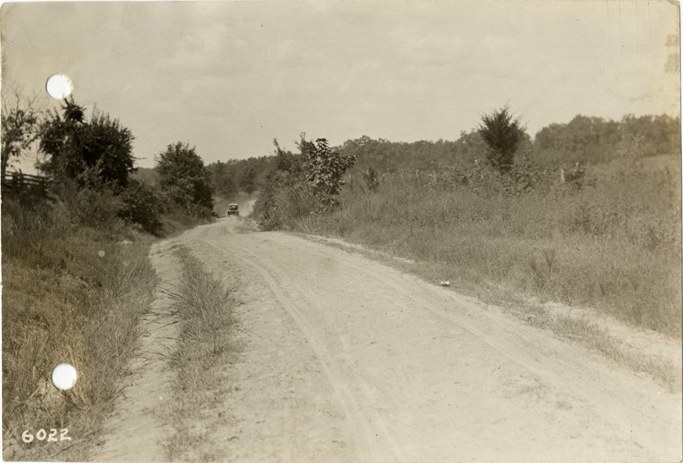 Distant view of Flanders electric car traveling on rural dirt road near Pickens, Mississippi during the pathfinding expedition for the 1912 Glidden Tour. The pathfinding tour covered a route from Detroit, Michigan to New Orleans, Louisiana, but the 1912 Glidden Tour was canceled. Stamped on back: "Spooner & Wells, Inc., photographers, 1231 Woodward Ave., Detroit, Mich., telephone North 1745." Handwritten on back: "The Pathfinder through the woods near Pickens, Miss., 1912. Tours--Glidden Tour, 1912."