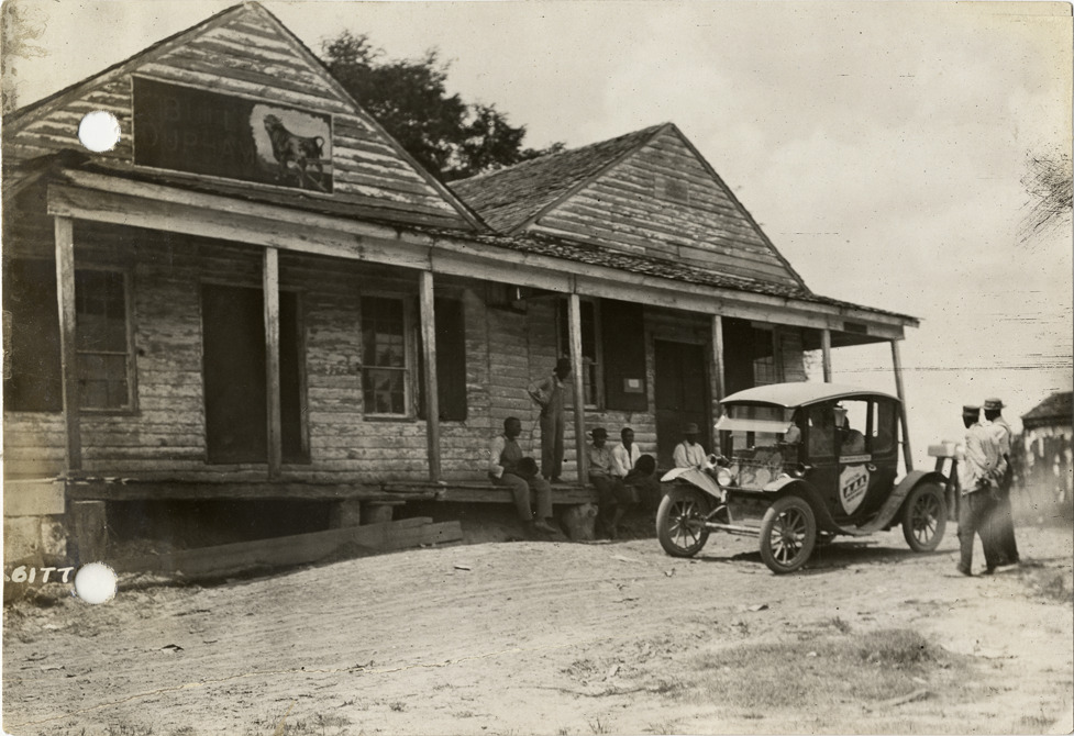 View of Flanders electric car in front of rural store near New Orleans, Louisiana during the pathfinding expedition for the 1912 Glidden Tour. Several men gather on porch. The pathfinding tour covered a route from Detroit, Michigan to New Orleans, Louisiana, but the 1912 Glidden Tour was canceled. Handwritten on back: "At a negro country store nearing New Orleans, pathfinding trip, 1912. Tours--Glidden Tour, 1912."