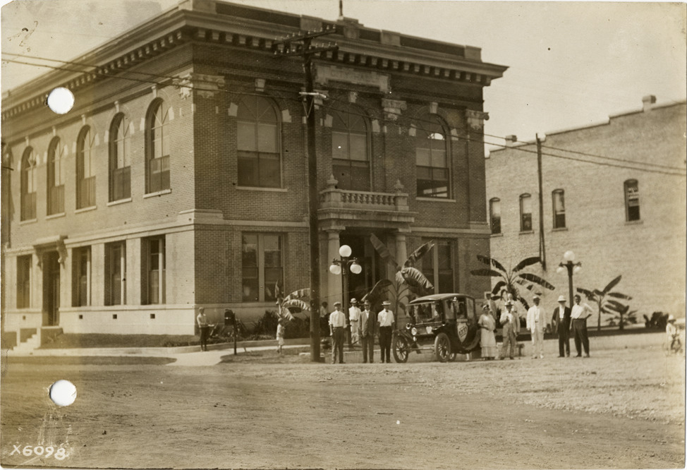 View of men posing with Flanders electric car in front of Brookhaven, Mississippi City Hall during the pathfinding expedition for the 1912 Glidden Tour. The pathfinding tour covered a route from Detroit, Michigan to New Orleans, Louisiana, but the 1912 Glidden Tour was canceled. Stamped on back: "Spooner & Wells, Inc., photographers, 1231 Woodward Ave., Detroit, Mich., telephone North 1745." Handwritten on back: "Pathfinder in front of the City Hall, Brookhaven, 1912. Tours--Glidden Tour, 1912."