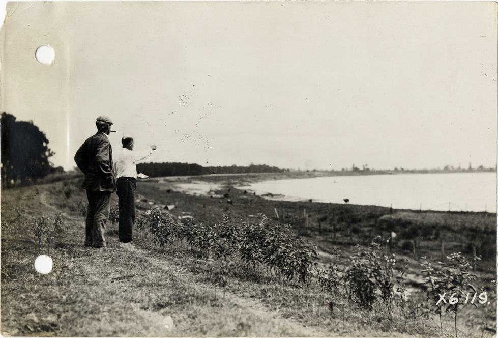 View of two men on Mississippi River levee during the pathfinding expedition for the 1912 Glidden Tour. The pathfinding tour covered a route from Detroit, Michigan to New Orleans, Louisiana, but the 1912 Glidden Tour was canceled. Handwritten on back: "Pathfinder on the Mississippi levee, 1912. Tours--Glidden Tour, 1912."
