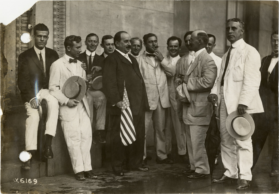 View of pathfinding team presenting flag to Martin Behrman, mayor of New Orleans, Louisiana, during the pathfinding expedition for the 1912 Glidden Tour. The pathfinding tour covered a route from Detroit, Michigan to New Orleans, Louisiana, but the 1912 Glidden Tour was canceled. Handwritten on back: "Presenting the flag to the mayor of New Orleans, 1912. Tours--Glidden Tour, 1912."