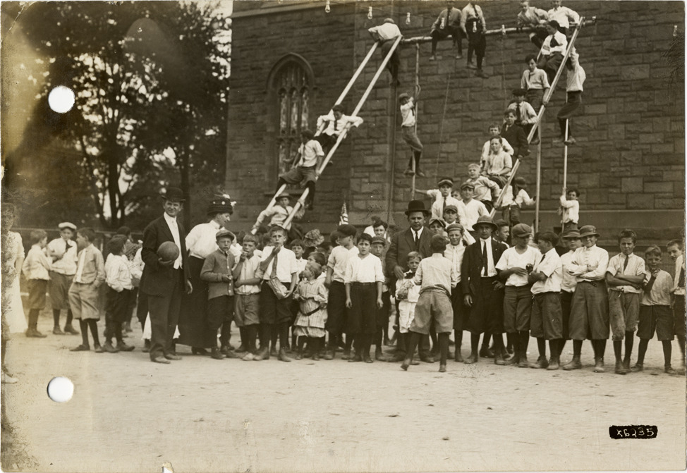 View of children posing in playground of Woodward Avenue Presbyterian Church in Detroit, Michigan during the pathfinding expedition for the 1912 Glidden Tour. Some children climb on playground equipment in background. The pathfinding tour covered a route from Detroit, Michigan to New Orleans, Louisiana, but the 1912 Glidden Tour was canceled. Handwritten on back: "Taken at playground for Presbyterian Church, Philadelphia & Woodward, Sept., 1912. Tours--Glidden Tour, 1912."