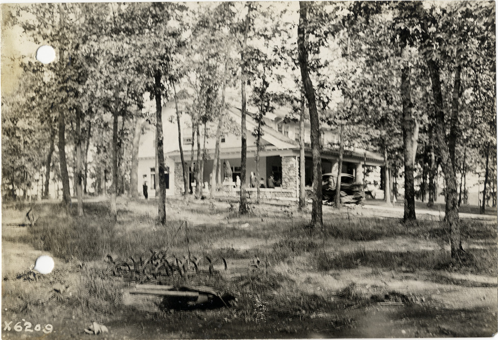 View through trees of house at the farm of Walter E. Flanders, Orchard Lake, Michigan, during the pathfinding expedition for the 1912 Glidden Tour. The American Press Humorists were hosted at an event at the farm. The pathfinding tour covered a route from Detroit, Michigan to New Orleans, Louisiana, but the 1912 Glidden Tour was canceled. Handwritten on back: "Press humorists at Mr. Flanders farm, Sept., 1912. Tours--Glidden Tour, 1912."