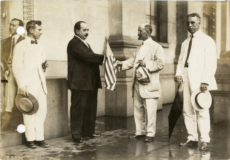 W.O. Westgard presenting flag to Mayor Martin Behrman, New Orleans, 1912 Glidden pathfinding expedition