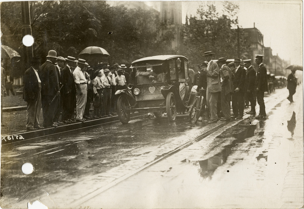 View of small crowd surrounding Flanders electric car on rainy day in New Orleans, Louisiana, during the pathfinding expedition for the 1912 Glidden Tour. Flanders car is leading a parade. The pathfinding tour covered a route from Detroit, Michigan to New Orleans, Louisiana, but the 1912 Glidden Tour was canceled. Handwritten on back: "Pathfinder leading parade in New Orleans in rain, 1912. Tours--Glidden Tour, 1912."