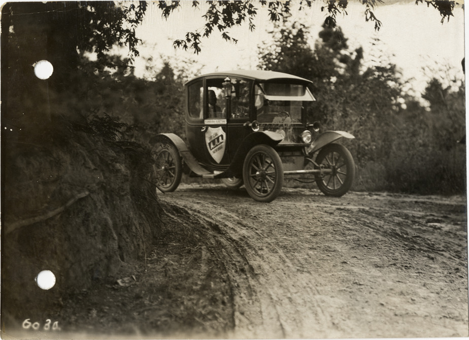 View of Flanders electric car on rural dirt road near Sumner, Mississippi during the pathfinding expedition for the 1912 Glidden Tour. The pathfinding tour covered a route from Detroit, Michigan to New Orleans, Louisiana, but the 1912 Glidden Tour was canceled. Stamped on back: "Spooner & Wells, Inc., photographers, 1231 Woodward Ave., Detroit, Mich., telephone North 1745." Handwritten on back: "Pathfinder near Sumner, Miss., 1912. Tours--Glidden Tour, 1912."