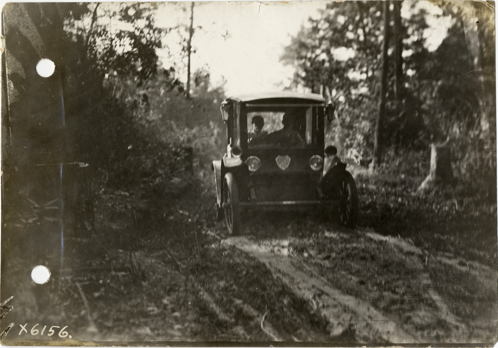 View of Flanders electric car traveling on rural dirt road near McComb, Mississippi during the pathfinding expedition for the 1912 Glidden Tour. The pathfinding tour covered a route from Detroit, Michigan to New Orleans, Louisiana, but the 1912 Glidden Tour was canceled. Handwritten on back: "Pathfinder near Macomb [sic], Miss., 1912. Tours--Glidden Tour, 1912."