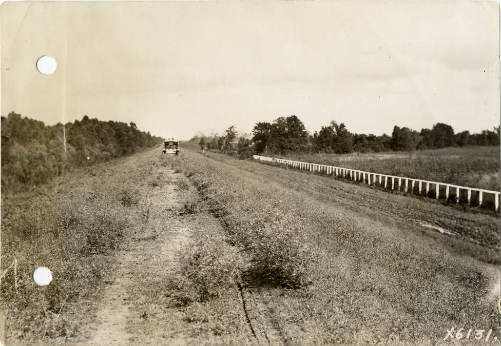 Distant view of Flanders electric car traveling on levee road near Baton Rouge, Louisiana during the pathfinding expedition for the 1912 Glidden Tour. The pathfinding tour covered a route from Detroit, Michigan to New Orleans, Louisiana, but the 1912 Glidden Tour was canceled. Handwritten on back: "Pathfinder on the levee road out of Baton Rouge, forty miles of this, 1912. Tours--Glidden Tour, 1912."