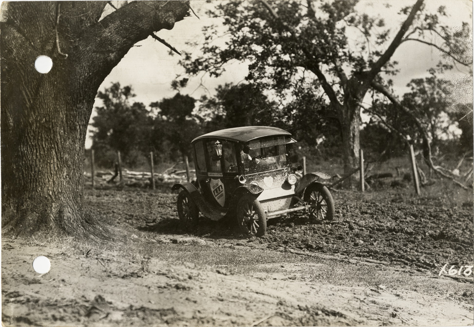 Flanders automobile traveling on muddy rural road near Baton Rouge, Louisiana, 1912 Glidden pathfinding expedition