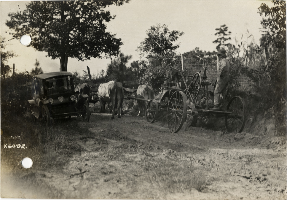 View of Flanders electric car passing ox-drawn farm equipment on rural dirt road during the pathfinding expedition for the 1912 Glidden Tour. The pathfinding tour covered a route from Detroit, Michigan to New Orleans, Louisiana, but the 1912 Glidden Tour was canceled. Stamped on back: "Spooner & Wells, Inc., photographers, 1231 Woodward Ave., Detroit, Mich., telephone North 1745." Handwritten on back: "Pathfinder meets an ox team, 1912. Tours--Glidden Tour, 1912."