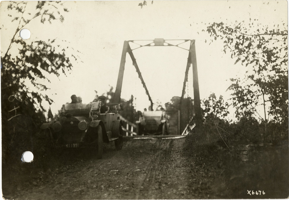 View of two cars crossing bridge in Tennessee during the 1912 Glidden Tour. Although the official 1912 Glidden Tour was canceled, Charles Glidden led a caravan over the identical route that had been originally planned, from Detroit, Michigan to New Orleans, Louisiana. Stamped on back: "Spooner & Wells, Inc., photographers, 1231 Woodward Ave., Detroit, Mich., telephone North 1745." Handwritten on back: "Over a bridge in Tennessee, Glidden Tour, 1912. Tours--Glidden Tour, 1912."