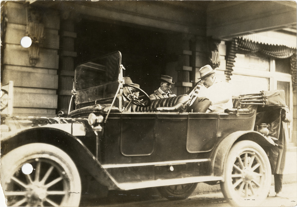View of Charles Glidden sitting in back seat of Maxwell car in front of the Hotel Anthony at Fort Wayne, Indiana during the 1912 Glidden Tour. Although the official 1912 Glidden Tour was canceled, Charles Glidden led a caravan over the identical route that had been originally planned, from Detroit, Michigan to New Orleans, Louisiana. Stamped on back: "Spooner & Wells, Inc., photographers, 1231 Woodward Ave., Detroit, Mich., telephone North 1745." Handwritten on back: "Glidden tourists at Hotel Anthony. Tours--Glidden Tour, 1912."