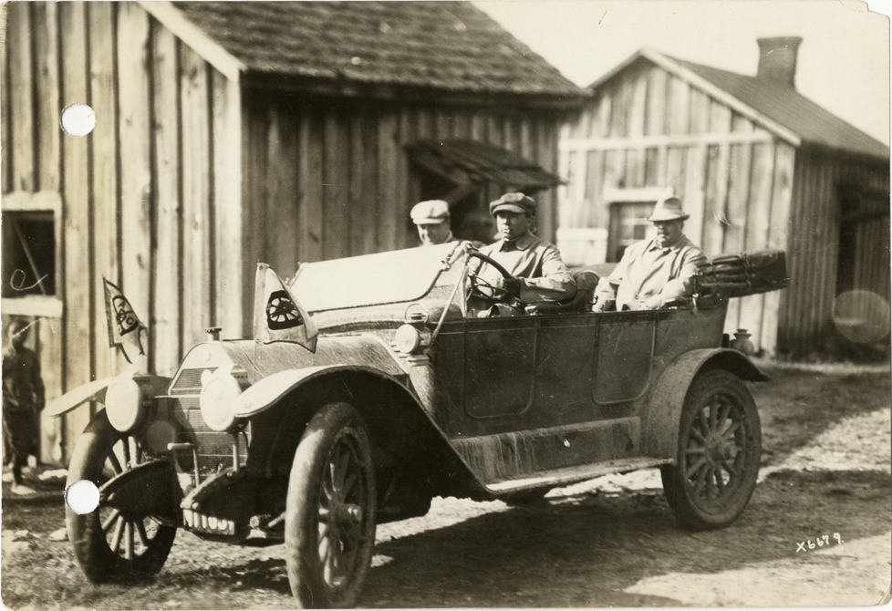 View of motorists posing in Maxwell car at Iuka, Mississippi during the 1912 Glidden Tour. Although the official 1912 Glidden Tour was canceled, Charles Glidden led a caravan over the identical route that had been originally planned, from Detroit, Michigan to New Orleans, Louisiana. Stamped on back: "Spooner & Wells, Inc., photographers, 1231 Woodward Ave., Detroit, Mich., telephone North 1745." Handwritten on back: "Leaving Iuka, Miss., 1912 Glidden Tour. Tours--Glidden Tour, 1912."