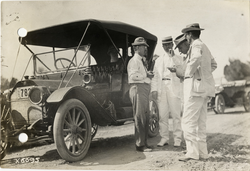View of W.O. Westgard and motorists standing next to Everitt car during the 1912 Glidden Tour. Although the official 1912 Glidden Tour was canceled, Charles Glidden led a caravan over the identical route that had been originally planned, from Detroit, Michigan to New Orleans, Louisiana. Stamped on back: "Spooner & Wells, Inc., photographers, 1231 Woodward Ave., Detroit, Mich., telephone North 1745." Handwritten on back: "Everitt, a conference, 1912. Tours--Glidden Tour, 1912."