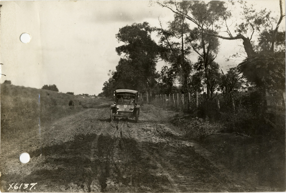 View of Flanders electric car traveling on muddy levee road between Darrow and New Orleans, Louisiana during the pathfinding expedition for the 1912 Glidden Tour. The pathfinding tour covered a route from Detroit, Michigan to New Orleans, Louisiana, but the 1912 Glidden Tour was canceled. Handwritten on back: "Pathfinder on the levee road between Darrow and New Orleans, 1912. Tours--Glidden Tour, 1912."