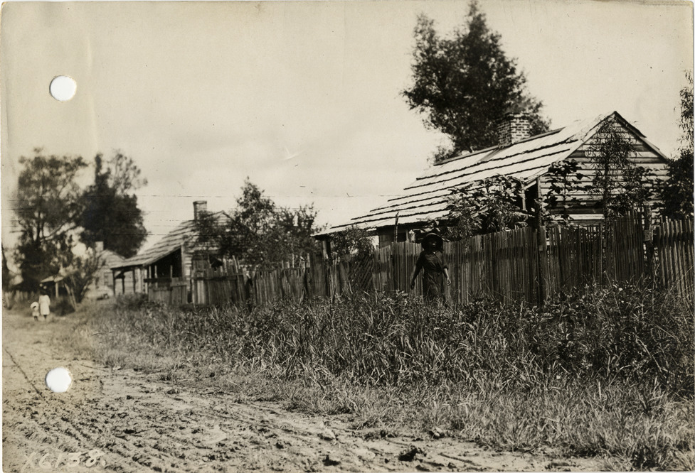 View of wooden-frame houses along the levee road between Darrow and New Orleans, Louisiana during the pathfinding expedition for the 1912 Glidden Tour. Woman walks next to wooden fence on roadside. The pathfinding tour covered a route from Detroit, Michigan to New Orleans, Louisiana, but the 1912 Glidden Tour was canceled. Handwritten on back: "Pathfinder on the levee road between Darrow and New Orleans, 1912. Tours--Glidden Tour, 1912."