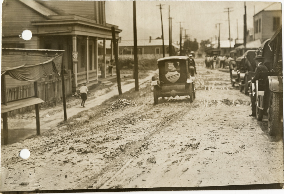 Rear view of Flanders electric car traveling on dirt road through McComb, Mississippi during the pathfinding expedition for the 1912 Glidden Tour. Boy runs along sidewalk; commercial buildings in background. The pathfinding tour covered a route from Detroit, Michigan to New Orleans, Louisiana, but the 1912 Glidden Tour was canceled. Handwritten on back: "Pathfinder in Macomb [sic], Miss., 1912. Tours--Glidden Tour, 1912."