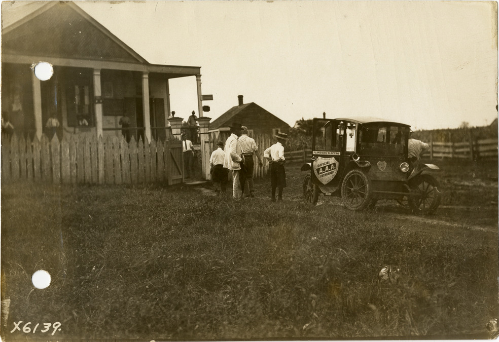 View of Flanders electric car parked in front of wooden-frame house on levee road between Darrow and New Orleans, Louisiana during the pathfinding expedition for the 1912 Glidden Tour. The pathfinding tour covered a route from Detroit, Michigan to New Orleans, Louisiana, but the 1912 Glidden Tour was canceled. Handwritten on back: "Pathfinder on the levee road between Darrow and New Orleans, 1912. Tours--Glidden Tour, 1912."