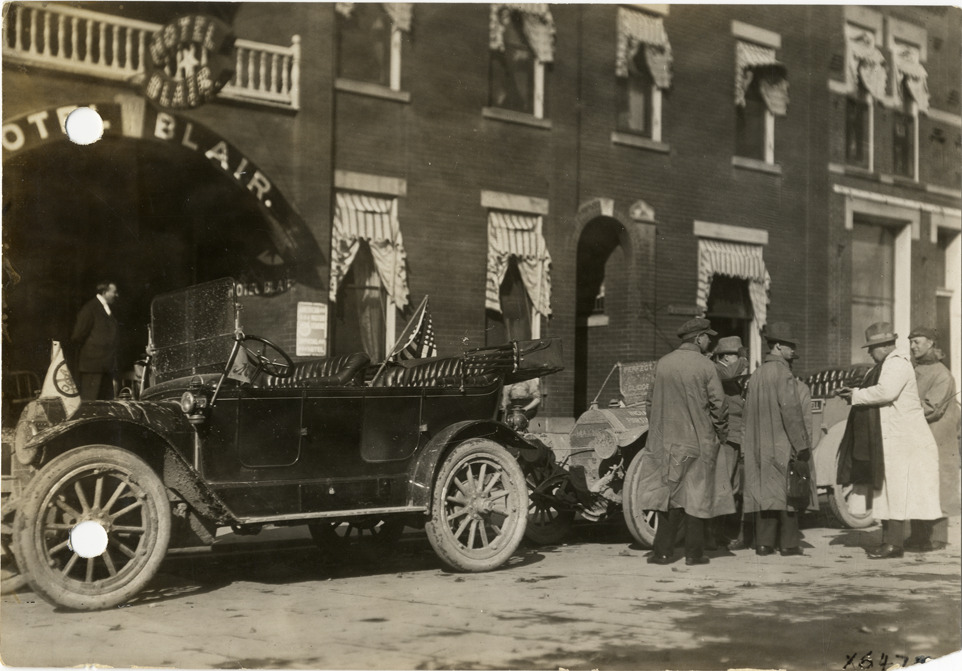 View of motorists with cars in front of the Hotel Blair at Wauseon, Ohio during the 1912 Glidden Tour. Maxwell car on right. Stamped on back: "Spooner & Wells, Inc., photographers, 1231 Woodward Ave., Detroit, Mich., telephone North 1745." Although the official 1912 Glidden Tour was canceled, Charles Glidden led a caravan over the identical route that had been originally planned, from Detroit, Michigan to New Orleans, Louisiana. Handwritten on back: "Glidden tourists ready to leave Hotel Blair, 1912. Tours--Glidden Tour, 1912."